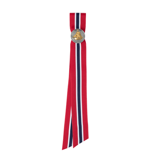 A unique and versatile 3-in-1 design. This piece can be worn in three different ways: as a national ribbon with a detailed silver medallion, as a round standalone pin, or as a small Restauration ship pin.